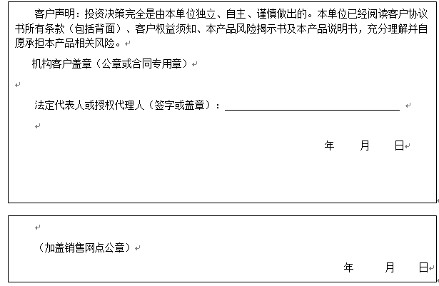 客户签名:                                    客户声明:投资决策完全是由客户独立、自主、谨慎做出的。客户已经阅读客户协议书所有条款(包括背面)、客户权益须知、本产品风险揭示书及本产品说明书,充分理解并自愿承担本产品相关风险。)