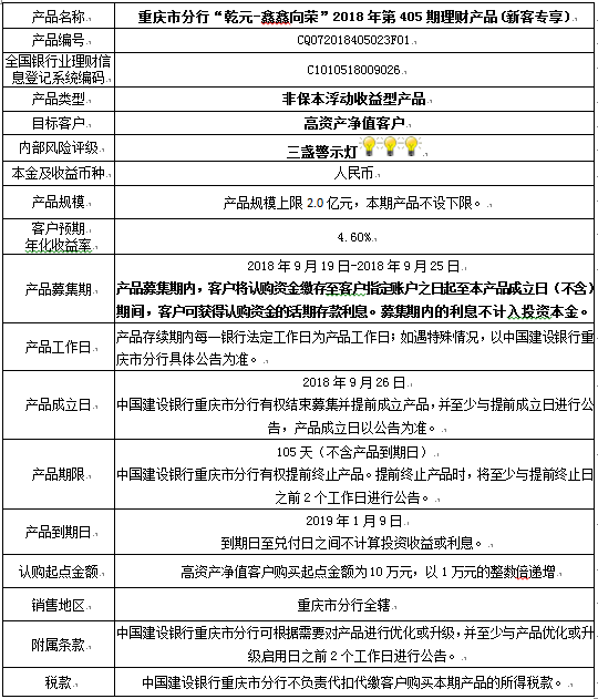 中国建设银行重庆市分行“乾元-鑫鑫向荣” 2018年第405期理财产品风险揭示书和产品说明书
