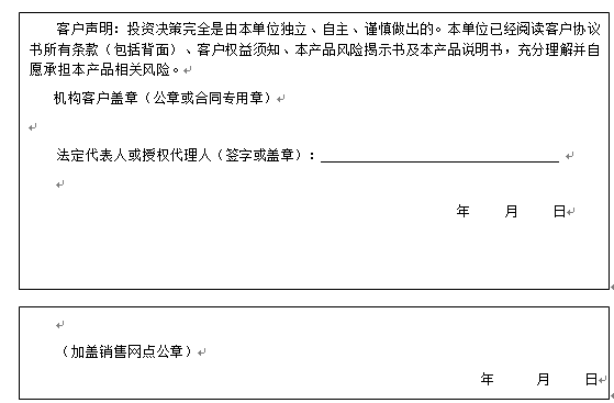 客户签名: ( 客户声明:投资决策完全是由客户独立、自主、谨慎做出的。客户已经阅读客户协议书所有条款(包括背面)、客户权益须知、本产品风险揭示书及本产品说明书,充分理解并自愿承担本产品相关风险。)