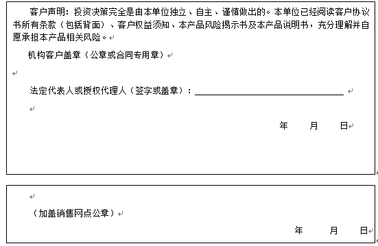 客户签名:                                    客户声明:投资决策完全是由客户独立、自主、谨慎做出的。客户已经阅读客户协议书所有条款(包括背面)、客户权益须知、本产品风险揭示书及本产品说明书,充分理解并自愿承担本产品相关风险。)
