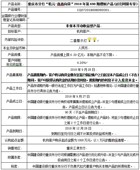 中国建设银行重庆市分行“乾元-鑫鑫向荣” 2018年第698期理财产品风险揭示书和产品说明书