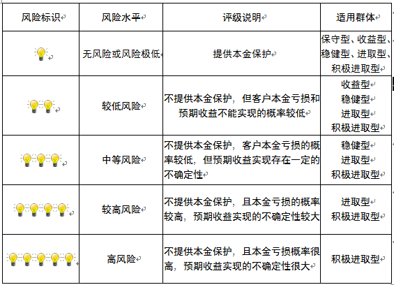 本产品为非保本浮动收益型理财产品,不保证本金和收益,请您充分认识投资风险,谨慎投资。本期产品期限为151天(中国建设银行有权对产品进行展期或提前终止),存续期内,产品不接受申购或赎回申请。本期产品内部风险评级级别为二盏警示灯,风险水平属于较低风险。最不利情况下,您将损失全部收益甚至包括全部本金。本理财产品适用于收益型、稳健型、进取型 、积极进取型客户。