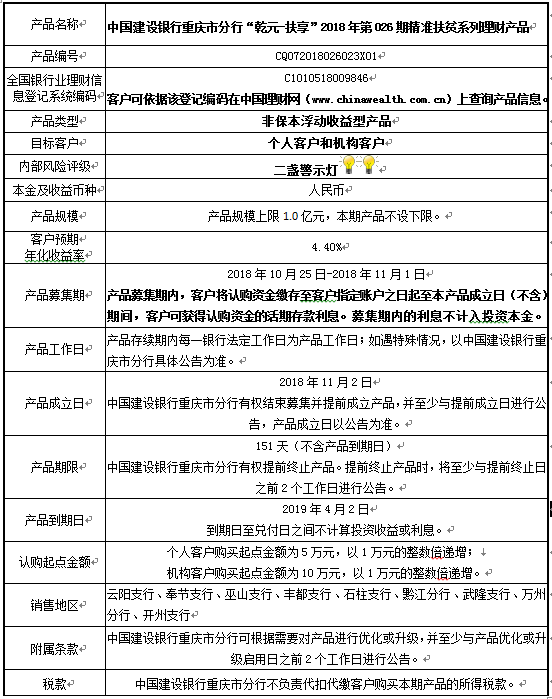 3.中国建设银行重庆市分行可根据市场情况等调整产品规模上、下限,并最迟于调整规模上下限当日进行公告。