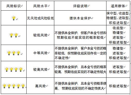 本产品为非保本浮动收益型理财产品,不保证本金和收益,请您充分认识投资风险,谨慎投资。本期产品期限为181天(中国建设银行有权对产品进行展期或提前终止),存续期内,产品不接受申购或赎回申请。本期产品内部风险评级级别为三盏警示灯 ,风险水平属于中等风险。最不利情况下,您将损失全部收益甚至包括全部本金。本理财产品适用于稳健型、进取型 、积极进取型客户。
