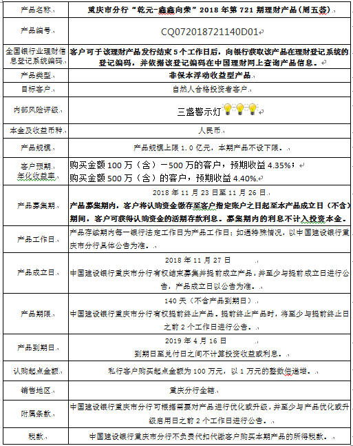 3.中国建设银行重庆市分行可根据市场情况等调整产品规模上、下限,并最迟于调整规模上下限当日进行公告。