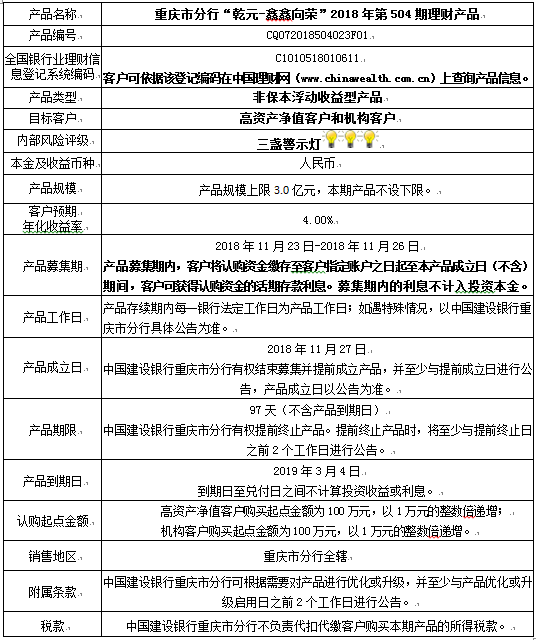3.中国建设银行重庆市分行可根据市场情况等调整产品规模上、下限,并最迟于调整规模上下限当日进行公告。