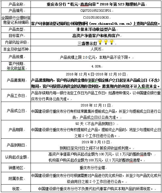 3.中国建设银行重庆市分行可根据市场情况等调整产品规模上、下限,并最迟于调整规模上下限当日进行公告。