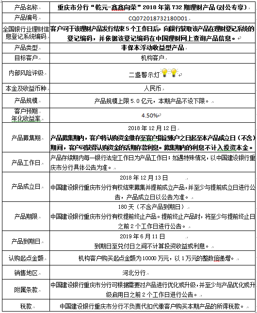 中国建设银行重庆市分行“乾元-鑫鑫向荣” 2018年第732期理财产品风险揭示书和产品说明书