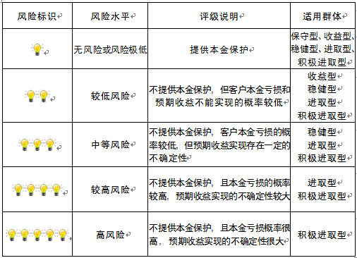 本产品为非保本浮动收益型理财产品,不保证本金和收益,请您充分认识投资风险,谨慎投资。本期产品期限为132天(中国建设银行有权对产品进行展期或提前终止),存续期内,产品不接受申购或赎回申请。本期产品内部风险评级级别为三盏警示灯 ,风险水平属于中等风险。最不利情况下,您将损失全部收益甚至包括全部本金。本理财产品适用于稳健型、进取型 、积极进取型客户。