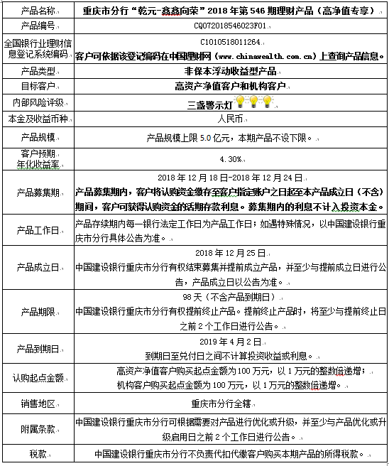 中国建设银行重庆市分行“乾元-鑫鑫向荣” 2018年第546期理财产品风险揭示书和产品说明书