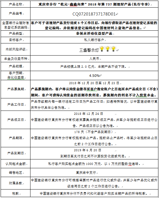 3.中国建设银行重庆市分行可根据市场情况等调整产品规模上、下限,并最迟于调整规模上下限当日进行公告。