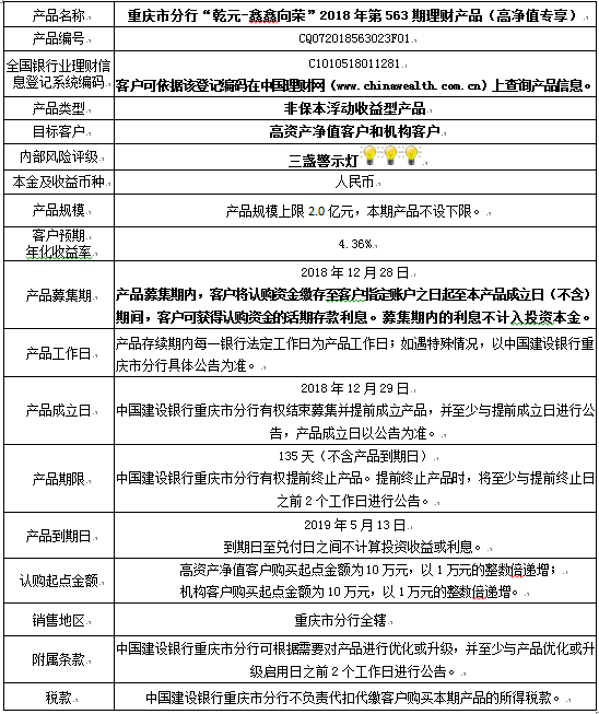 本产品为非保本浮动收益型理财产品,不保证本金和收益,请您充分认识投资风险,谨慎投资。本期产品期限为135天(中国建设银行有权对产品进行展期或提前终止),存续期内,产品不接受申购或赎回申请。本期产品内部风险评级级别为三盏警示灯 ,风险水平属于中等风险。最不利情况下,您将损失全部收益甚至包括全部本金。本理财产品适用于稳健型、进取型 、积极进取型客户。