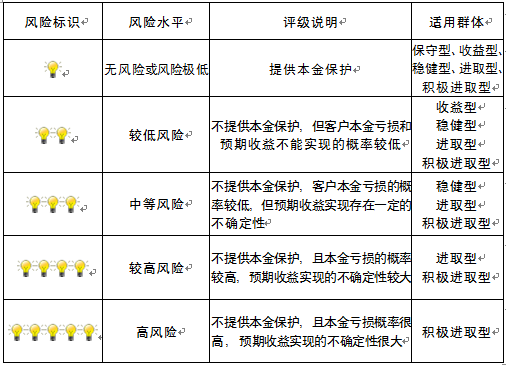 本产品为非保本浮动收益型理财产品,不保证本金和收益,请您充分认识投资风险,谨慎投资。本期产品期限为258天(中国建设银行有权对产品进行展期或提前终止),存续期内,产品不接受申购或赎回申请。本期产品内部风险评级级别为二盏警示灯 ,风险水平属于较低风险。最不利情况下,您将损失全部收益甚至包括全部本金。本理财产品适用于收益型、稳健型、进取型 、积极进取型客户。