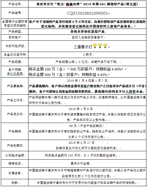 中国建设银行重庆市分行“乾元-鑫鑫向荣” 2019年第601期理财产品风险揭示书和产品说明书