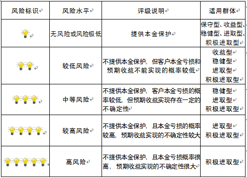 本产品为非保本浮动收益型理财产品,不保证本金和收益,请您充分认识投资风险,谨慎投资。本期产品期限为92天(中国建设银行有权对产品进行展期或提前终止),存续期内,产品不接受申购或赎回申请。本期产品内部风险评级级别为盏警示灯 ,风险水平属于较低风险。最不利情况下,您将损失全部收益甚至包括全部本金。本理财产品适用于收益型、稳健型、进取型 积极进取型客户。