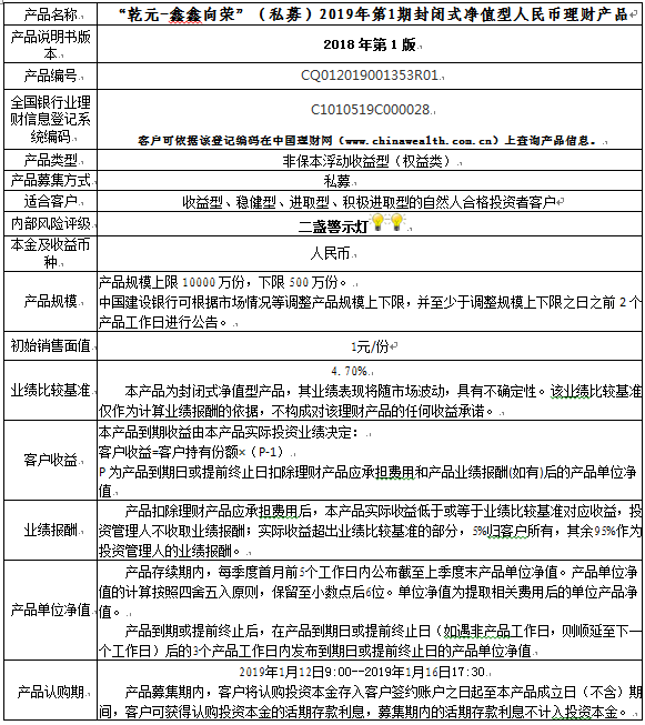 本产品为封闭式净值型理财产品,不保证本金和收益,请您充分认识投资风险,谨慎投资。本产品任何业绩比较基准、测算收益或类似表述均属不具有法律约束力的用语,不代表客户可能获得的实际收益,亦不构成中国建设银行重庆市分行对本产品的任何收益承诺。产品期限为固定期限(中国建设银行重庆市分行有权提前终止产品),存续期内产品不接受赎回申请。 本期产品内部风险评级级别为二盏警示灯 ,风险程度属于较低风险,适用于收益型、稳健型、进取型和积极进取型客户。最不利情况下,本期产品投资的资产无法回收任何本金和净收益,客户将损失全部本金。投资者不得使用贷款、发行债券等筹集的非自有资金投资本产品。如影响您风险承受能力的因素发生变化,请及时完成风险承受能力评估。