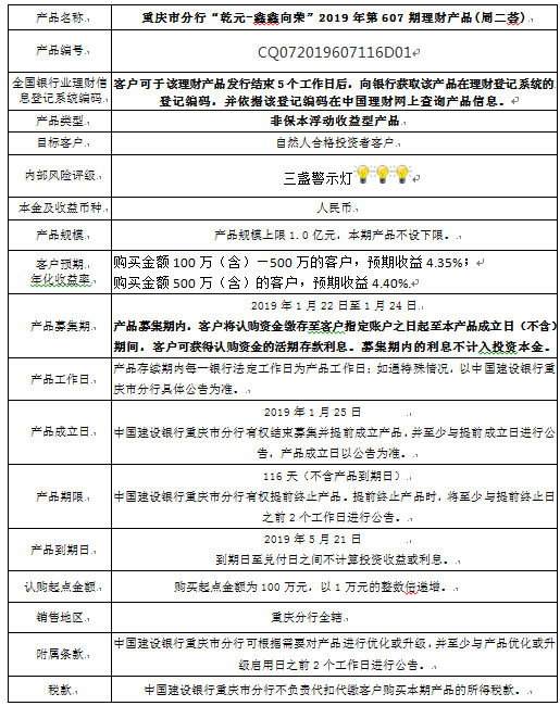 中国建设银行重庆市分行“乾元-鑫鑫向荣” 2019年第607期理财产品风险揭示书和产品说明书