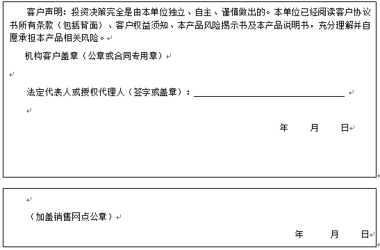 客户签名: ( 客户声明:投资决策完全是由客户独立、自主、谨慎做出的。客户已经阅读客户协议书所有条款(包括背面)、客户权益须知、本产品风险揭示书及本产品说明书,充分理解并自愿承担本产品相关风险。)