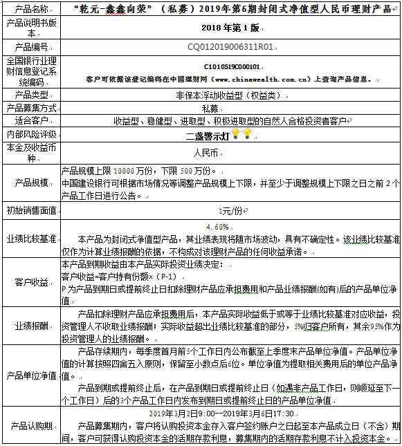 中国建设银行重庆市分行“乾元-鑫鑫向荣”(私募)2019年 第6期封闭式净值型人民币理财产品风险揭示书和产品说明书