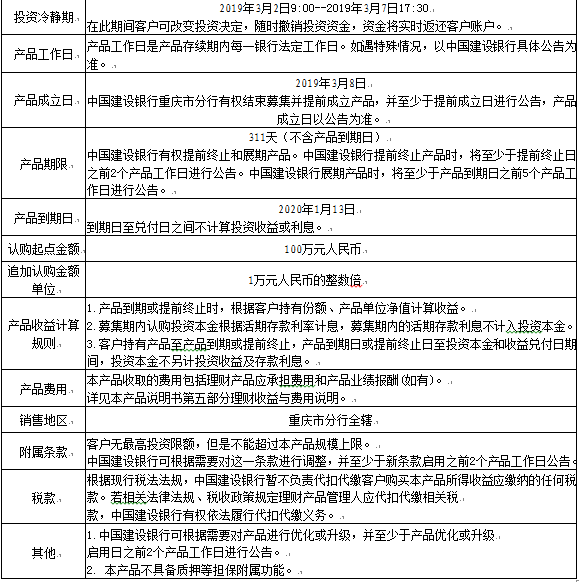 1.本产品不保障本金和收益安全,中国建设银行重庆市分行发行本产品不代表对本产品的任何保本或收益承诺。