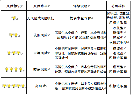本产品为非保本浮动收益型理财产品,不保证本金和收益,请您充分认识投资风险,谨慎投资。本期产品期限为365天(中国建设银行有权对产品进行展期或提前终止),存续期内,产品不接受申购或赎回申请。本期产品内部风险评级级别为二盏警示灯 ,风险水平属于较低风险。最不利情况下,您将损失全部收益甚至包括全部本金。本理财产品适用于收益型、稳健型、进取型 、积极进取型客户。