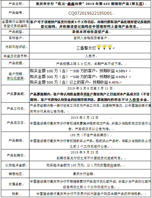中国建设银行重庆市分行“乾元-鑫鑫向荣” 2019年第622期理财产品风险揭示书和产品说明书