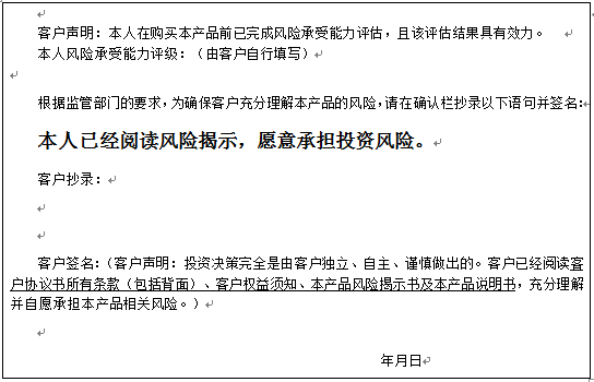 个人客户请在下面填写您的风险承受能力评级、抄录风险揭示语句并签字: