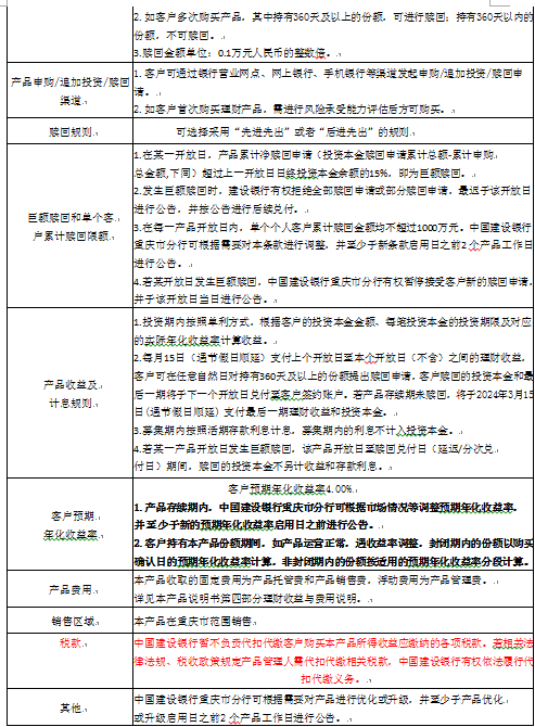 4.中国建设银行重庆市分行可根据市场情况等调整预期年化收益率,并至少于新的预期年化收益率启用日前进行公告。
