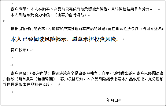 个人客户请在下面填写您的风险承受能力评级、抄录风险揭示语句并签字: