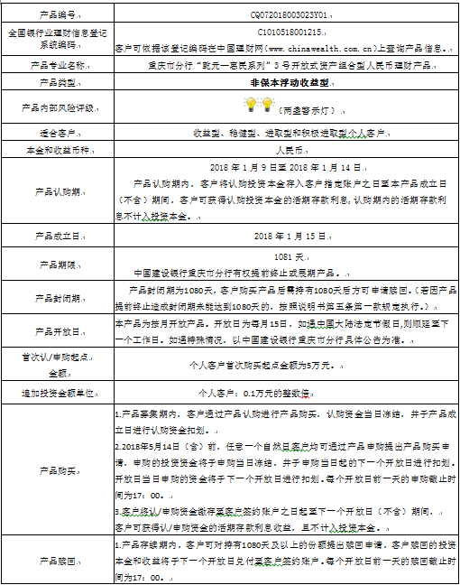 本产品为非保本浮动收益型理财产品,不保证本金和收益,请您充分认识投资风险,谨慎投资。产品期限为1081天(中国建设银行重庆市分行有权提前终止或展期产品),产品存续期内任一自然日接受申购/追加投资申请,客户可对持有1080天及以上的份额提出赎回申请(超过单个客户累计赎回限额的赎回申请除外,巨额赎回时请以公告为准)。产品内部风险评级级别为二盏警示灯,风险程度属于较低风险。最不利情况下,基础资产无法回收任何本金和收益,客户将损失全部本金。产品适合于收益型、稳健型、进取型、积极进取型客户。