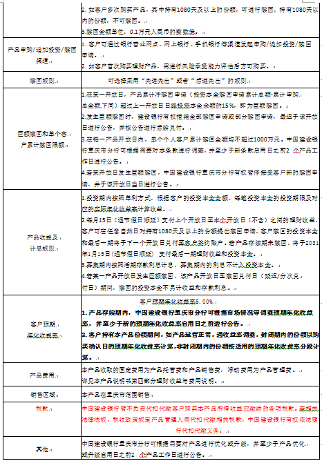 4.中国建设银行重庆市分行可根据市场情况等调整预期年化收益率,并至少于新的预期年化收益率启用日前进行公告。