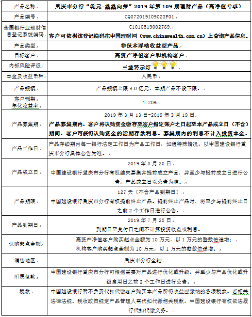 中国建设银行重庆市分行“乾元-鑫鑫向荣” 2019年第109期理财产品风险揭示书和产品说明书