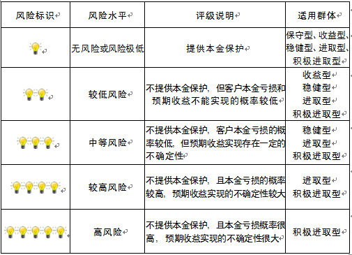 本产品为非保本浮动收益型理财产品,不保证本金和收益,请您充分认识投资风险,谨慎投资。本期产品期限为265天(中国建设银行有权对产品进行展期或提前终止),存续期内,产品不接受申购或赎回申请。本期产品内部风险评级级别为三盏警示灯 ,风险水平属于中等风险。最不利情况下,您将损失全部收益甚至包括全部本金。本理财产品适用于稳健型、进取型 、积极进取型客户。