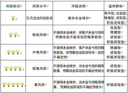 本产品为非保本浮动收益型理财产品,不保证本金和收益,请您充分认识投资风险,谨慎投资。本期产品期限为94天(中国建设银行有权对产品进行展期或提前终止),存续期内,产品不接受申购或赎回申请。本期产品内部风险评级级别为三盏警示灯 ,风险水平属于中等风险。最不利情况下,您将损失全部收益甚至包括全部本金。本理财产品适用于稳健型、进取型 、积极进取型客户。