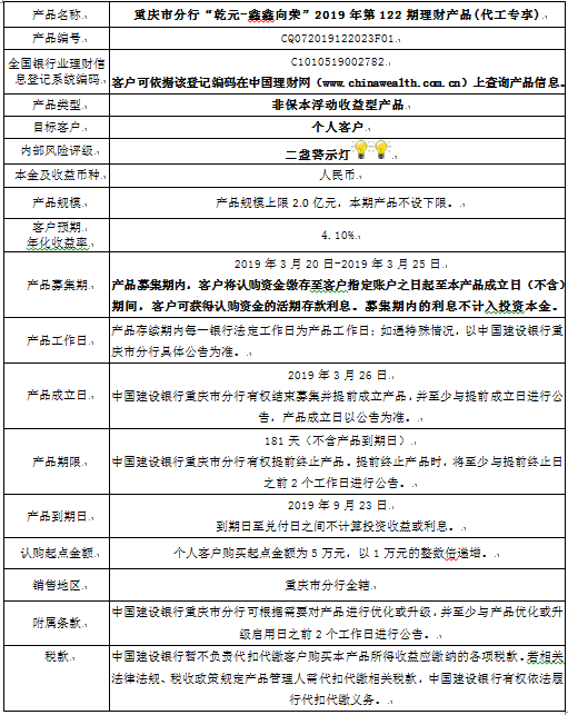 3.中国建设银行重庆市分行可根据市场情况等调整产品规模上、下限,并最迟于调整规模上下限当日进行公告。