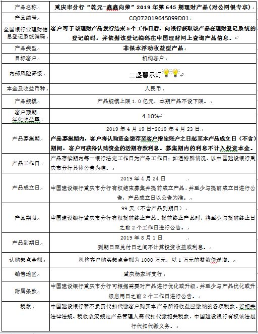 3.中国建设银行重庆市分行可根据市场情况等调整产品规模上、下限,并最迟于调整规模上下限当日进行公告。