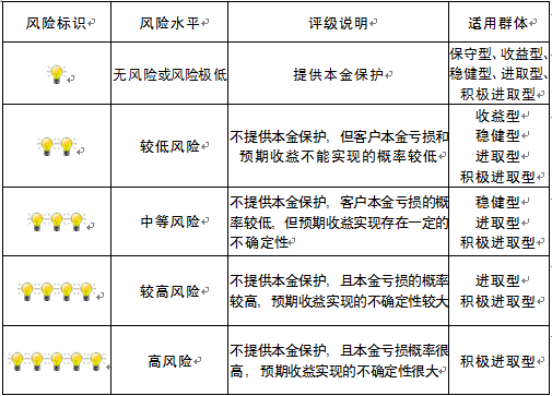 本产品为非保本浮动收益型理财产品,不保证本金和收益,请您充分认识投资风险,谨慎投资。本期产品期限为127天(中国建设银行有权对产品进行展期或提前终止),存续期内,产品不接受申购或赎回申请。本期产品内部风险评级级别为二盏警示灯 ,风险水平属于较低风险。最不利情况下,您将损失全部收益甚至包括全部本金。本理财产品适用于收益型、稳健型、进取型 、积极进取型客户。