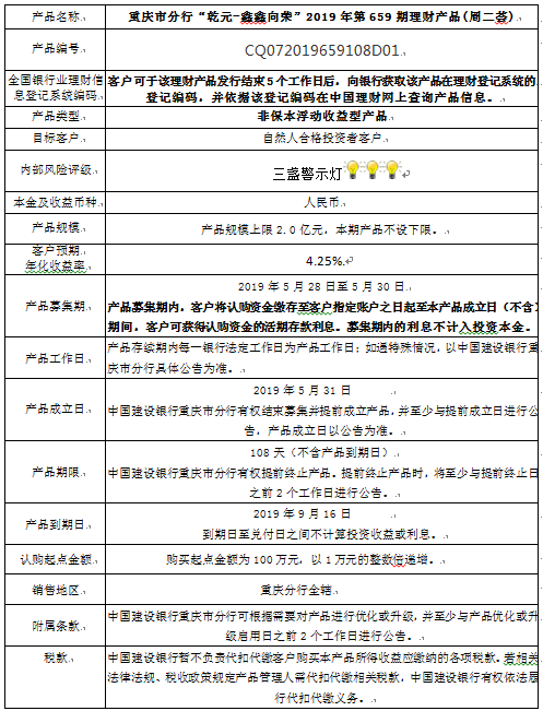 中国建设银行重庆市分行“乾元-鑫鑫向荣” 2019年第659期理财产品风险揭示书和产品说明书