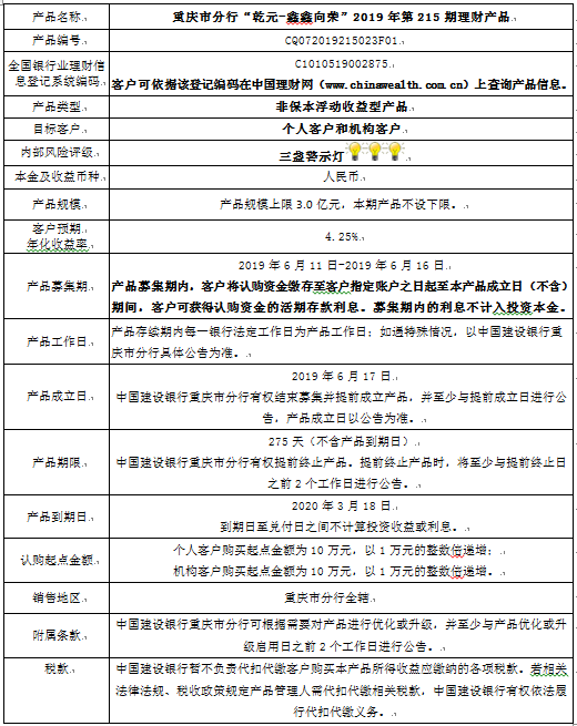 3.中国建设银行重庆市分行可根据市场情况等调整产品规模上、下限,并最迟于调整规模上下限当日进行公告。