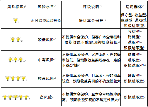 本产品为非保本浮动收益型理财产品,不保证本金和收益,请您充分认识投资风险,谨慎投资。本期产品期限为182天(中国建设银行有权对产品进行展期或提前终止),存续期内,产品不接受申购或赎回申请。本期产品内部风险评级级别为二盏警示灯 ,风险水平属于较低风险。最不利情况下,您将损失全部收益甚至包括全部本金。本理财产品适用于收益型、稳健型、进取型 、积极进取型客户。