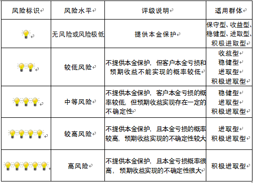本产品为非保本浮动收益型理财产品,不保证本金和收益,请您充分认识投资风险,谨慎投资。本期产品期限为125天(中国建设银行有权对产品进行展期或提前终止),存续期内,产品不接受申购或赎回申请。本期产品内部风险评级级别为三盏警示灯 ,风险水平属于中等风险。最不利情况下,您将损失全部收益甚至包括全部本金。本理财产品适用于稳健型、进取型 、积极进取型客户。