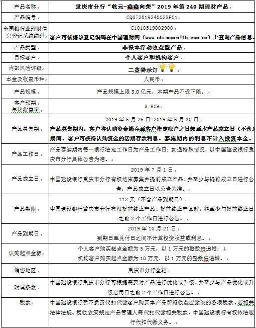 中国建设银行重庆市分行“乾元-鑫鑫向荣” 2019年第240期理财产品风险揭示书和产品说明书