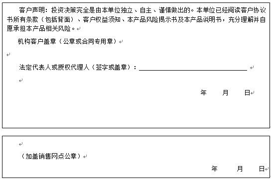 客户签名:                                    客户声明:投资决策完全是由客户独立、自主、谨慎做出的。客户已经阅读客户协议书所有条款(包括背面)、客户权益须知、本产品风险揭示书及本产品说明书,充分理解并自愿承担本产品相关风险。)