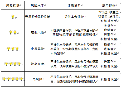 本产品为非保本浮动收益型理财产品,不保证本金和收益,请您充分认识投资风险,谨慎投资。本期产品期限183天(中国建设银行有权对产品进行展期或提前终止),存续期内,产品不接受申购或赎回申请。本期产品内部风险评级级别为盏警示灯,风险水平属于中等风险。最不利情况下,您将损失全部收益甚至包括全部本金。本理财产品适用于稳健型进取型 积极进取型客户。