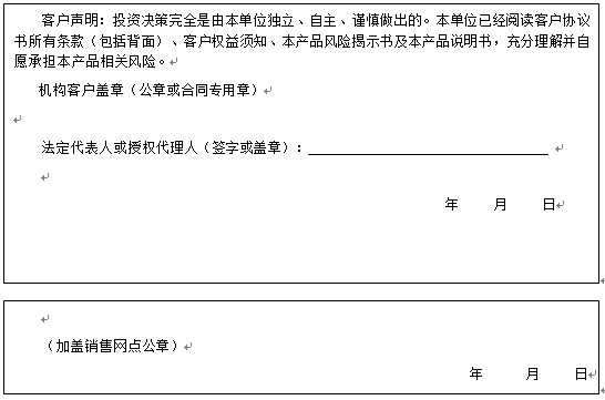 客户签名: ( 客户声明:投资决策完全是由客户独立、自主、谨慎做出的。客户已经阅读客户协议书所有条款(包括背面)、客户权益须知、本产品风险揭示书及本产品说明书,充分理解并自愿承担本产品相关风险。)