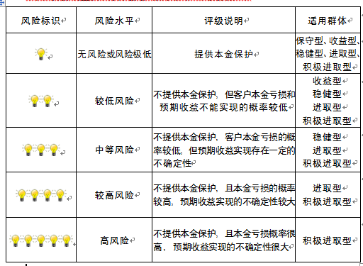 本产品为非保本浮动收益型理财产品,不保证本金和收益,请您充分认识投资风险,谨慎投资。本期产品期限为182天(中国建设银行有权对产品进行展期或提前终止),存续期内,产品不接受申购或赎回申请。本期产品内部风险评级级别为盏警示灯 ,风险水平属于较低风险。最不利情况下,您将损失全部收益甚至包括全部本金。本理财产品适用于收益型、稳健型、进取型 积极进取型客户。