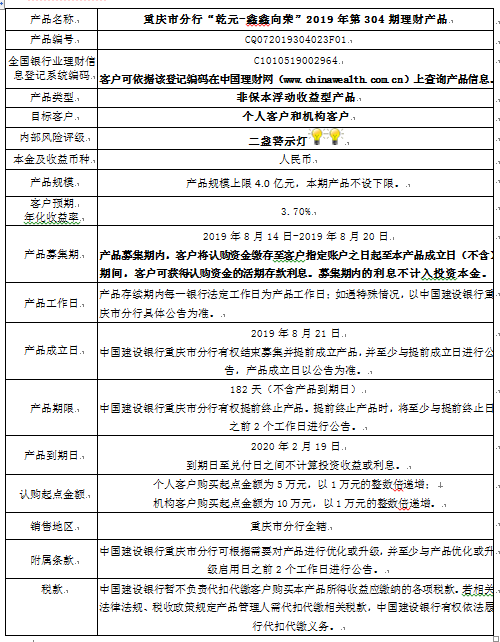 中国建设银行重庆市分行“乾元-鑫鑫向荣” 2019年第304期理财产品风险揭示书和产品说明书