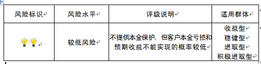 本产品为封闭式净值型理财产品,不保证本金和收益,请您充分认识投资风险,谨慎投资。本产品任何业绩比较基准、测算收益或类似表述均属不具有法律约束力的用语,不代表客户可能获得的实际收益,亦不构成中国建设银行重庆市分行对本产品的任何收益承诺。产品期限为固定期限(中国建设银行重庆市分行有权提前终止产品),存续期内产品不接受赎回申请。 本期产品内部风险评级级别为二盏警示灯 ,风险程度属于较低风险,适用于收益型、稳健型、进取型和积极进取型客户。最不利情况下,本期产品投资的资产无法回收任何本金和净收益,客户将损失全部本金。投资者不得使用贷款、发行债券等筹集的非自有资金投资本产品。如影响您风险承受能力的因素发生变化,请及时完成风险承受能力评估。