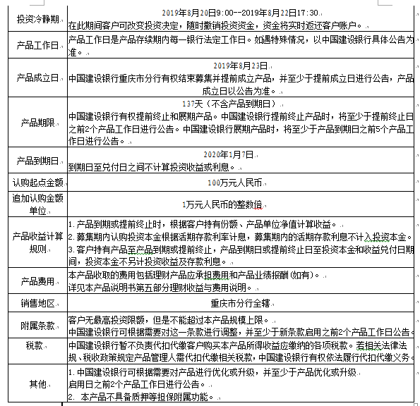 (一)中国建设银行重庆市分行通过中国建设银行网站(www.ccb.com)披露产品以下相关信息:在产品正常成立、产品终止、发生对产品产生重大影响之情形后的5个产品工作日内发布产品成立、产品终止、重大影响事件等信息;如中国建设银行拟调整产品规模上下限、调整业绩比较基准、调整投资范围、投资品种或投资比例、优化或升级产品、行使提前终止权,则需在调整规模上下限之日、新的业绩比较基准启用日、新的投资范围、投资品种或投资比例启用日、产品优化或升级启用日、提前终止日等相关日之前至少2个产品工作日进行公告;如中国建设银行拟调整本产品相关费用费率或延长产品期限,则需在费用费率调整日或产品到期日之前至少5个产品工作日进行公告;如发生产品到期时的延迟/分次兑付情形,则于该情形发生后的2个产品工作日内进行公告;产品存续期内,每季度首月前5个工作日内公布截至上季度末产品的资产净值、份额净值和其他重要信息;产品到期或提前终止后,在产品到期日或提前终止日(如遇非产品工作日,则顺延至下一个工作日)后的3个产品工作日内发布到期日或提前终止日的产品资产净值、份额净值和其他重要信息。