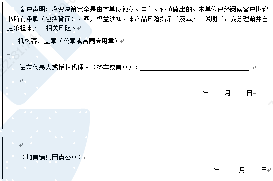 客户签名: ( 客户声明:投资决策完全是由客户独立、自主、谨慎做出的。客户已经阅读客户协议书所有条款(包括背面)、客户权益须知、本产品风险揭示书及本产品说明书,充分理解并自愿承担本产品相关风险。)